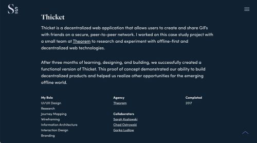 在每个作品的前半部分,Sam都提供了项目的初步总结,清楚地说明了他在项目中扮演的角色,合作者以及完成时间。
