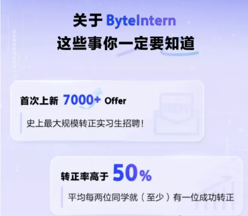 大家先看两个炸裂数据:字节今年暑期实习直接干到 7000 人,转正率超 50%,研发岗就放出4800+offer。